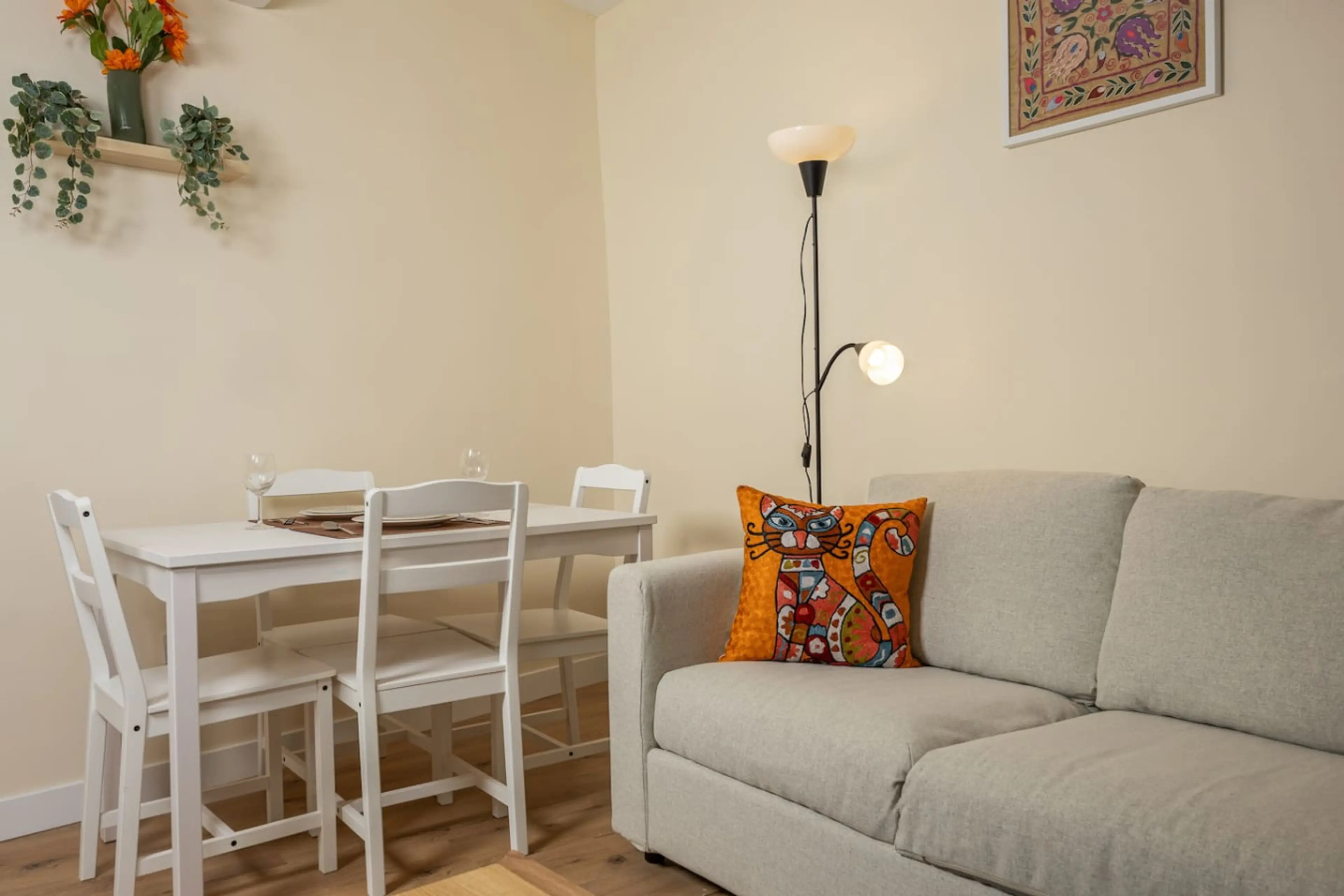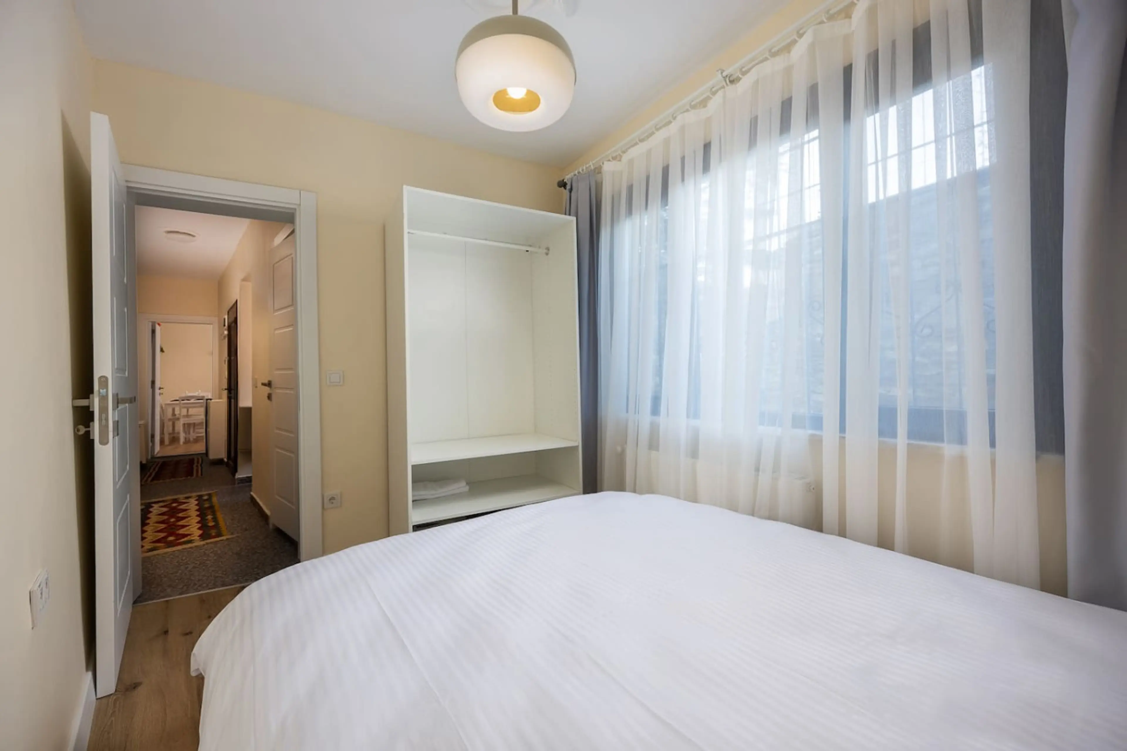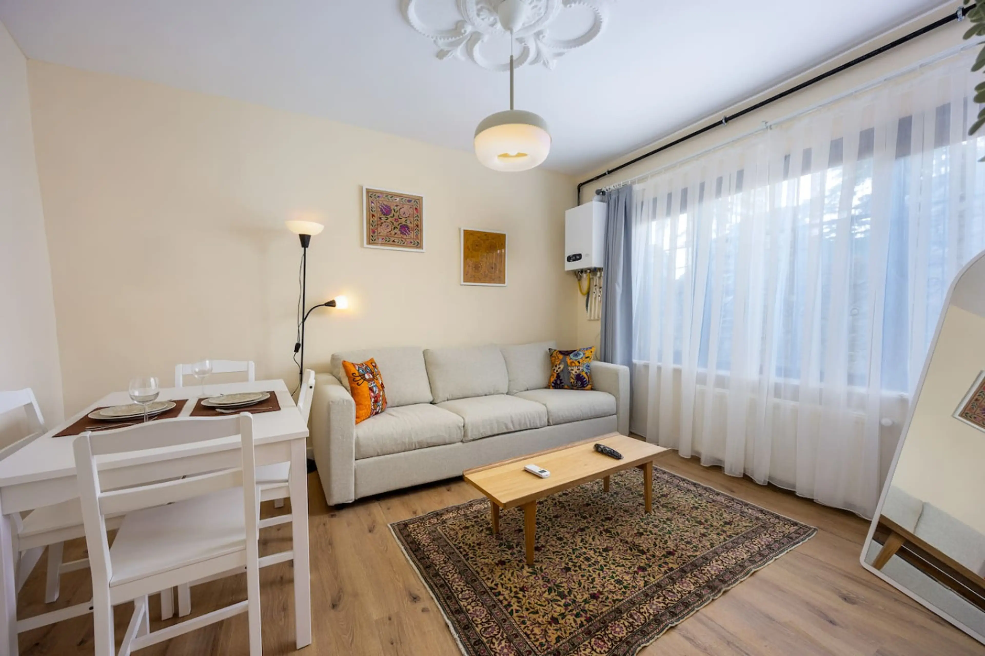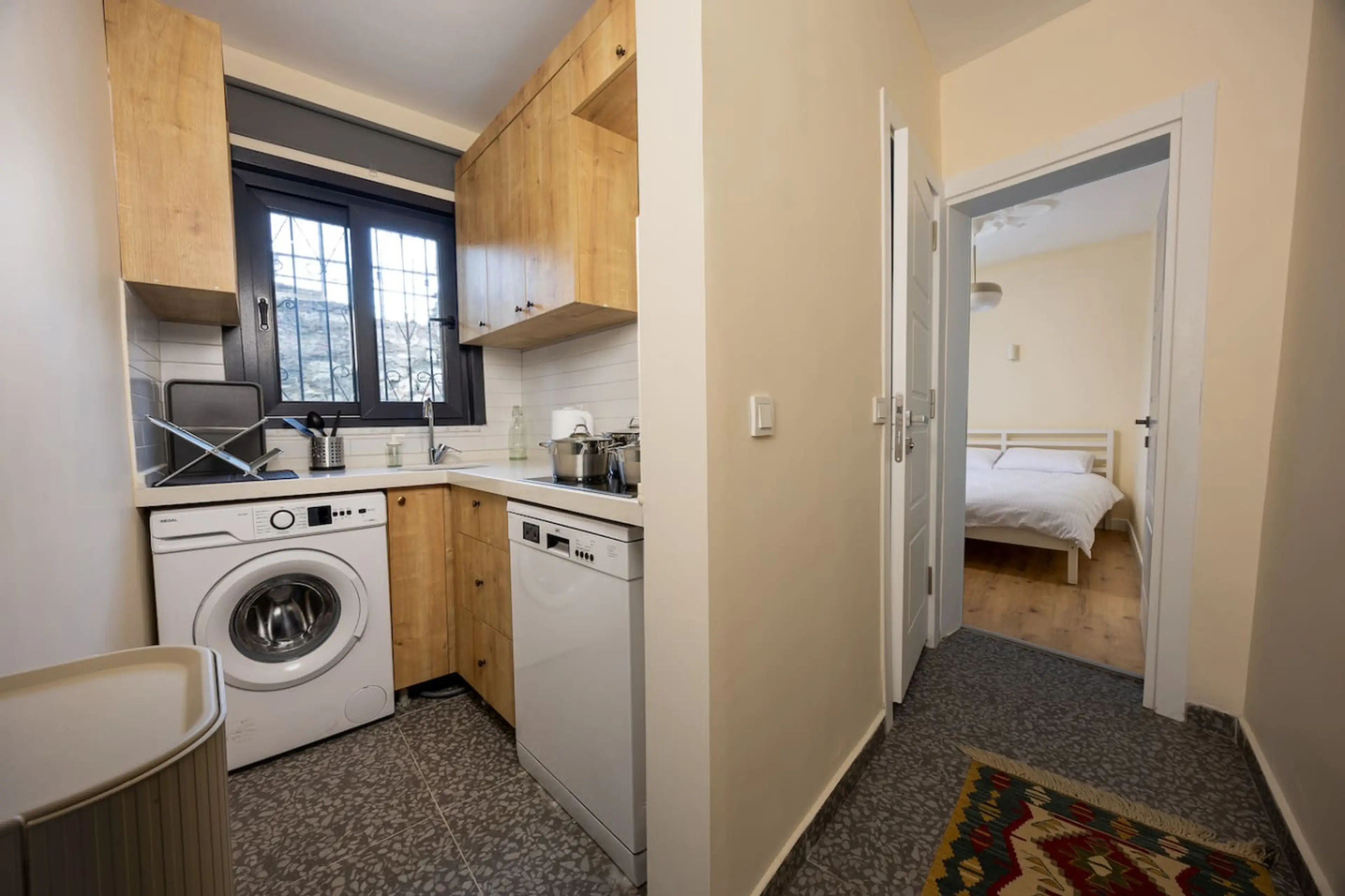 Bright and welcoming flat in historic Balat, designed for comfort and style. The living room features a cozy sofa, dining space, handwoven rugs, and colorful Turkic pillow cases for an authentic touch. A fully equipped kitchen with modern appliances, washing machine, and dishwasher ensures convenien...
